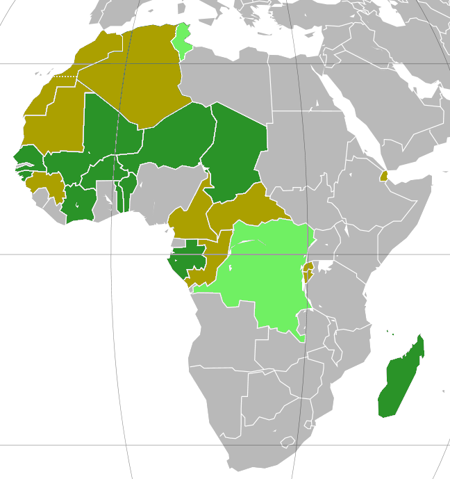 Situation actuelle : Les pays ayant ratifié le Protocole pour éliminer le commerce illicite des produits du tabac (PCI) sont indiqués en vert foncé sur la carte de l'Afrique ci-dessous. Les pays ayant signé le Protocole sans l'avoir ratifié à ce jour sont en vert clair. Les pays n'ayant ni signé, ni ratifié le Protocole sont en couleur olive. Seuls les pays de l'Afrique francophone sont pris en compte. Les autres pays sont en gris clair, quel que soit le statut de leur ratification.